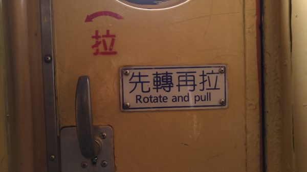 仕切りのドアはまったく奥が見えない独特なもの。「ドア故障」の張り紙があるのは貸切運用時一般客が入ってこないようにするためでしょうか?
