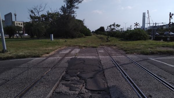 その先は右折して踏切を渡り港方面へ、一旦離れた線路と合流します。この踏切の手前で線路は二股に分岐しています(奥が台中港駅方面)