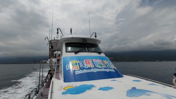港への移動~乗船までを撮影しなかったのでいきなり海の上。港には何艘もの観光船が停泊していましたが、私達が乗ったのはその中でも最も小型の噶瑪蘭號。カップルを意識したのか内装はピンクづくし