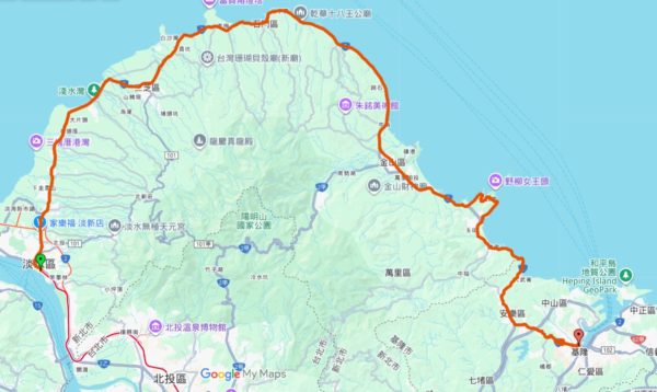 起終点の高低差がないためどちらから走っても有利・不利はないのですが、アップダウンの多い(=体力を消耗する)区間や景色に面白みのない区間の位置などを考慮した結果淡水→基隆方向に決定。実際に走ったコースはこちら