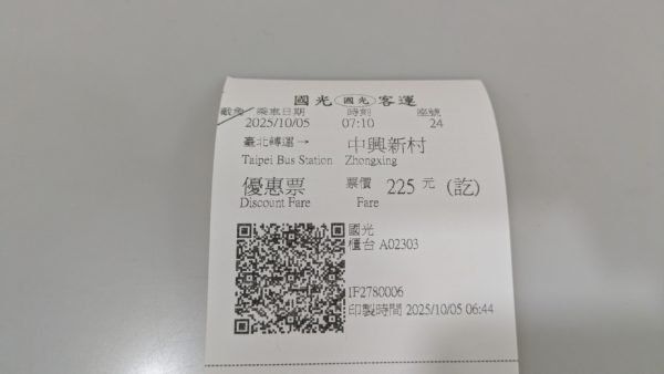 こんな感じのレシート券が出てきます。南投まで乗って225元と非常にお安いですが、これは連休割引運賃のため。日本では繁忙期に運賃が割増のなるのが普通ですが、台湾では逆に安くすることが多いです。これには少しでも公共交通に人を流してマイカー利用を減らすのと経営が苦しいバス業界を救済する効果があり、国があれこれ補助金を出しています
