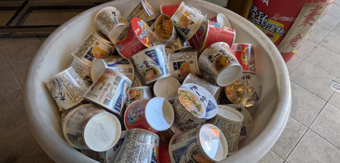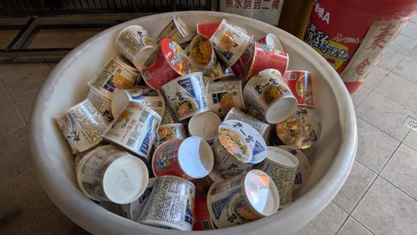 そして早速カップラーメンコーナー。後方の棚に加え手前の巨大カップいっぱいにラーメンが入っています