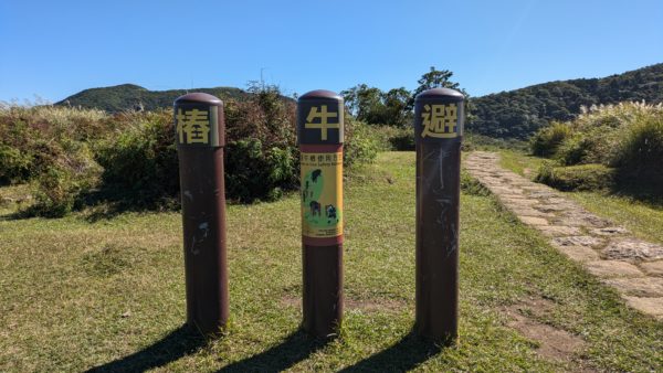 擎天崗名物、牛ガード。万一襲われたら杭の手前に避難します。牛はまっすぐ突っ込んでくるので躱せるという仕組み