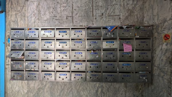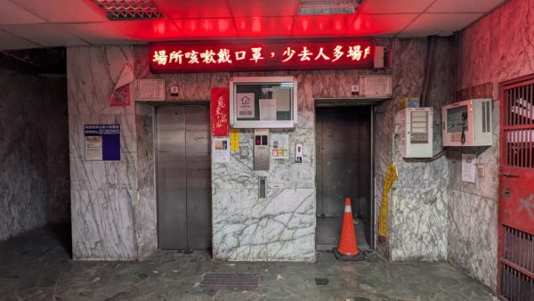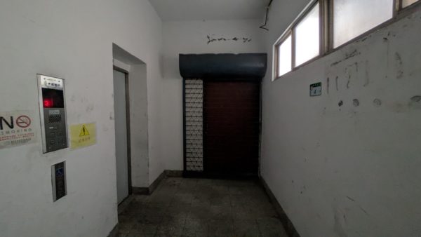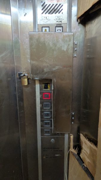 住宅部分も問題なさそうな部分(4階以下は公共機関などが入居)まで行ってみました。エレベータホールからすでに荒れた感じで一基は停止しています