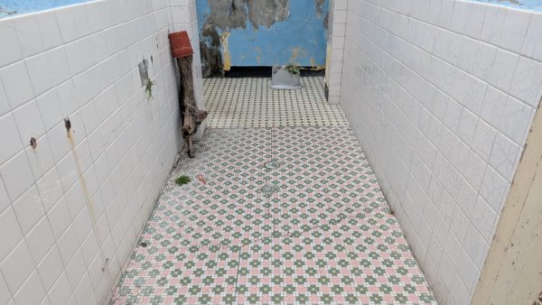 見事なタイルの床。元は浴室だったと思われるこのスペースも今は屋外