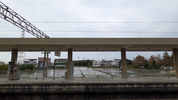 有人駅で窓口と写っていませんが券売機が1台という営業体制。フェンスの中に外された古い駅名看板がありますね。駅舎自体も改装中の様子