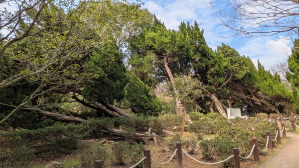 左手奥へ進むと樹木エリア。このあたり一帯の木は強風に煽られたかのように一斉に傾いていました。折れていないのに途中から曲がっていたりしますし、わざとこのように育てたのでしょうか?