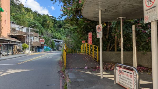 台北・新北市境に到着。左の方に小さく境界プレートが写っていてギリギリの場所にあるバス停は新北市スタイル
