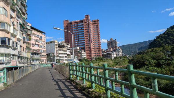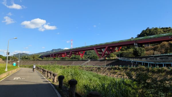 サイクリングロードは両岸の台北市部分に設置されていますが、今日は右岸線を走ります。このあたりは山が迫っているため緑が多く見られ、対岸は新北市新店區でマンションが林立