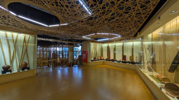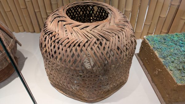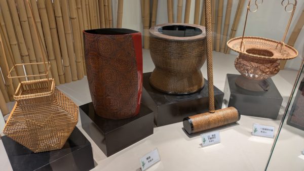 続いて竹編のコーナー。展示された作品もそうですが、天井までもが竹編です