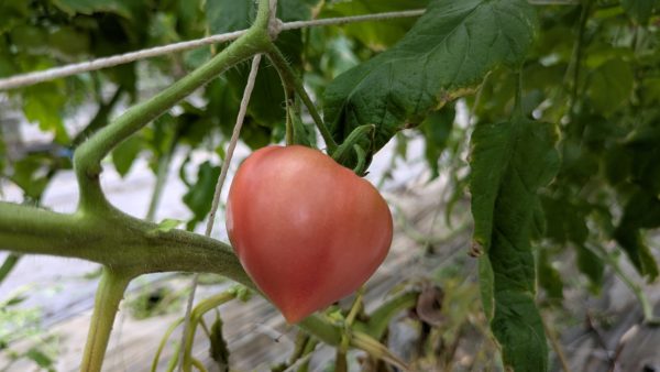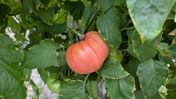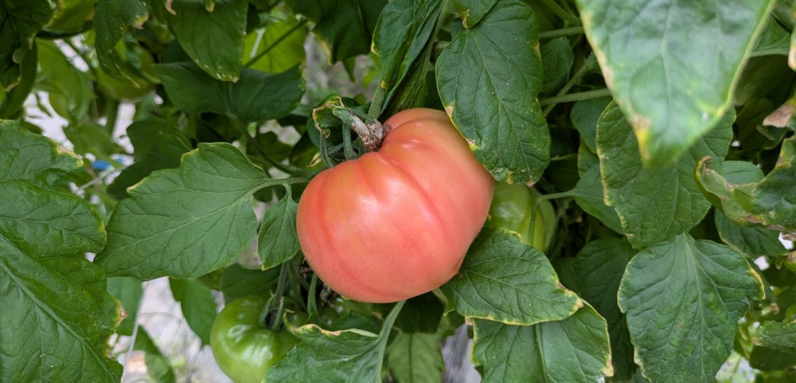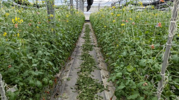 まずは桃太郎の方から。こちらはパッと見緑しか見えませんが、少しでも赤みを帯びていたら収穫できるとのこと。実際ご主人は完全に緑のものもガンガン収穫していました