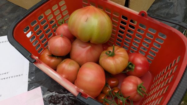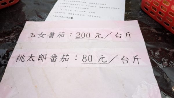 まず受付をして籠とハサミを受け取ります。お持ち帰りは桃太郎が80元/600g、ミニトマトが200元/600g