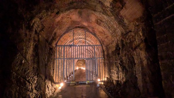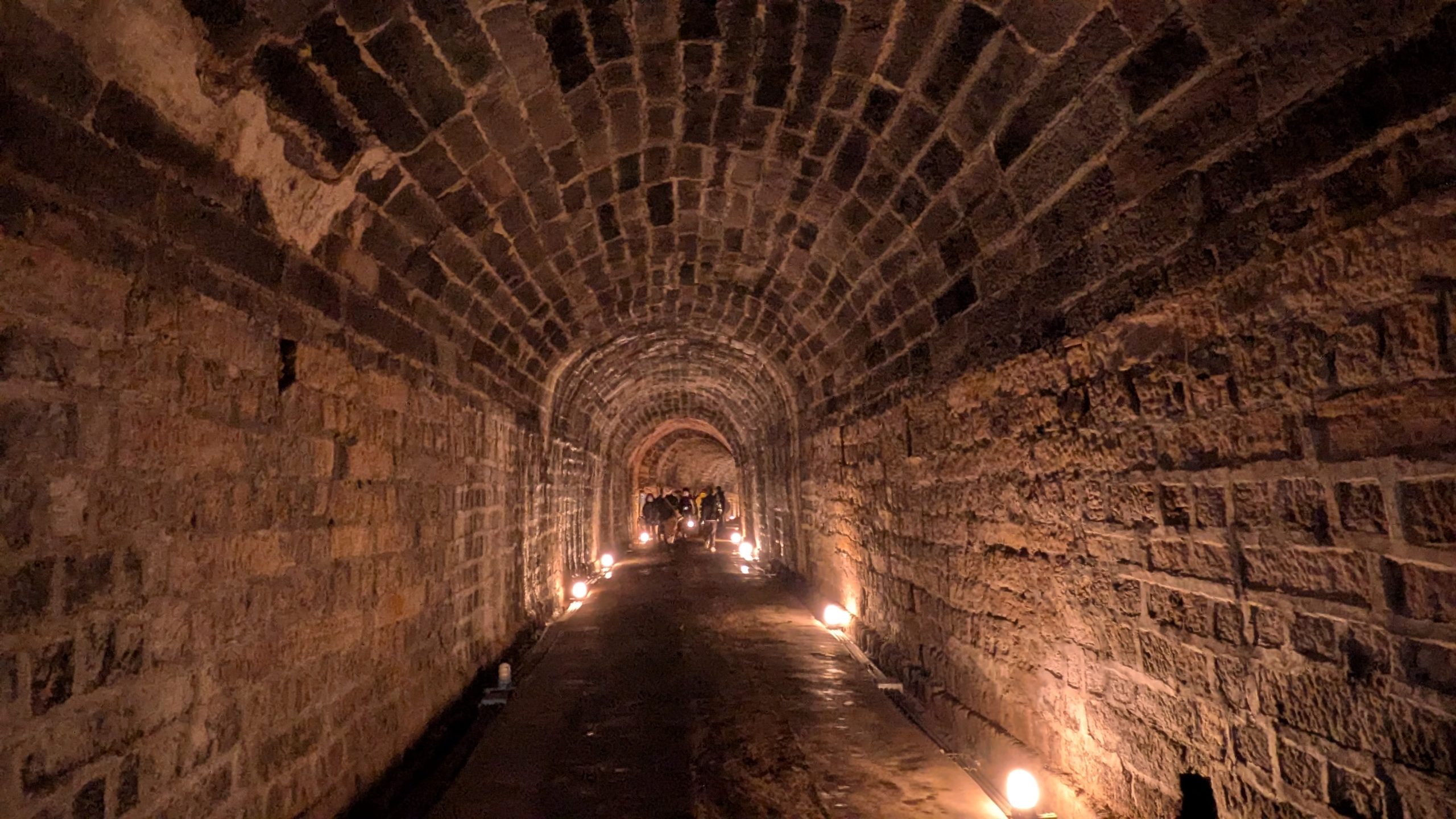 第二区間はレンガ造りですが、その境界線が大きくズレてしまっています。このトンネルは南北から同時に掘り進めましたが、測量ミスから貫通時に4m以上もの高低差ができてしまいました。追加で掘り下げるなどして調整しましたが、それでもなおこうして痕跡がはっきりと残っています