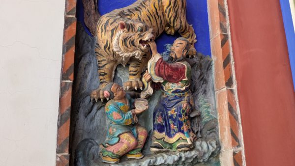 壁には虎に手を噛ませているすごい彫刻が施されていますが、これは二十四孝ですね。昔の中国の親孝行ストーリーで、現代の価値観からすると過激なものが多いです
