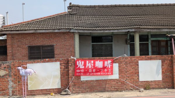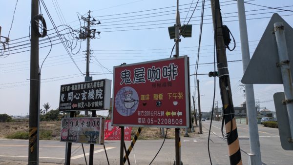 公共交通でのアクセスはしづらいのでUbikeで現地へ。北側(文化路)から入ってきて縣82線に左折する交差点のところに鬼屋咖啡(お化け屋敷カフェ)という看板が立っていました。なぜか描かれているのは日本の「鬼」です