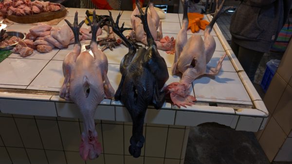 鶏はどの店もこのように台から頭を垂れる並べ方をしていました。嘉義スタイル?