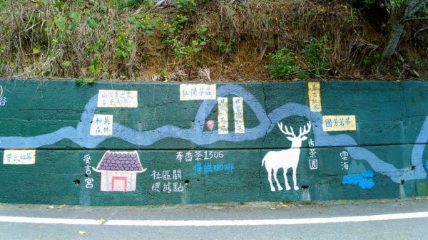 コンクリートの壁に書かれた手作りマップ。どこにその茶農家があるかとてもわかりやすいです。
