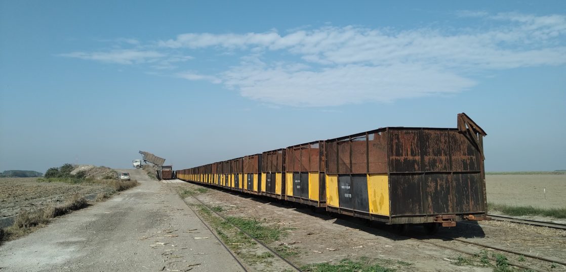 遠くて見づらいですが、ここはトラックが高いところへ登り貨車へ落とし込む構造。