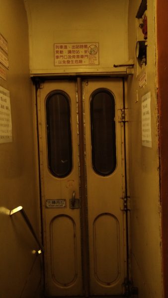 客室とデッキの仕切扉上部・天井にはレトロな非常灯