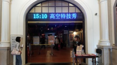 チケットは休日350元とそこそこしますが、200元分の金券が付いてきます。このことは事前に知っていたので昼食に充てるべく、昼前に着くよう仕込みました。入口ではショーの時間が案内されています。
