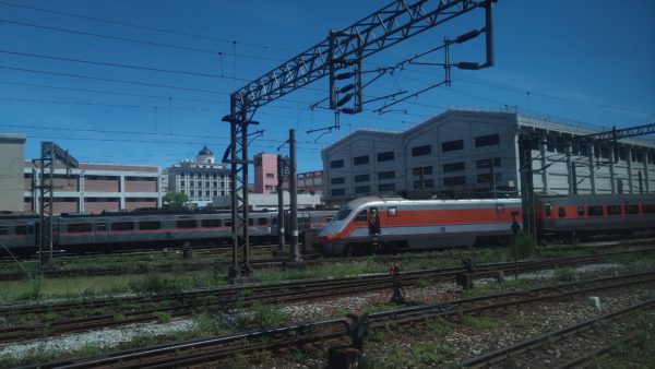 台北から3時間40分が経過、もうすぐ中間地点の花蓮駅に到着。駅に隣接して車両基地があるため多数の車両が留置されており、丁度PP自強が出庫していくところでした。